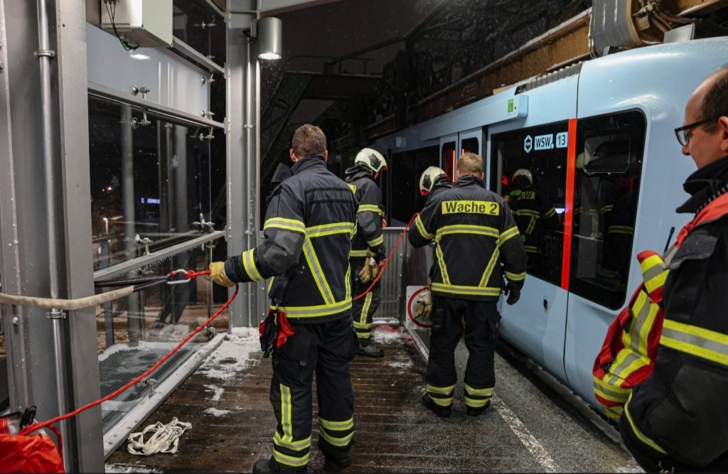 Foto: Florian PetersenDa sich im Bereich der rechten Vordertür eine ungesicherte, absturzgefährdete Stelle befand, war ein gefahrloses Verlassen durch die Fahrgäste nicht möglich. Nach kurzer Abwägung aller Optionen entschied die Feuerwehr, die kritische Zone abzusichern und so eine sichere Evakuierung zu ermöglichen. Hierzu wurde zunächst die Ausstiegsstelle von Schnee und Eis befreit. Anschließend wurde ein speziell gesicherter Feuerwehrmann der Berufsfeuerwehr so positioniert, dass ein gefahrloses Aussteigen der Fahrgäste möglich war. In enger Abstimmung mit der Fahrerin wurden so alle 16 Personen unverletzt aus der Schwebebahn geführt. Der Einsatz konnte nach 60 Minuten erfolgreich beendet werden.