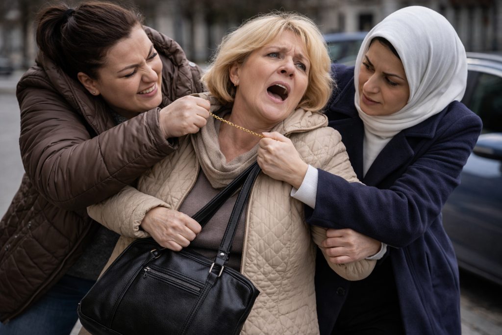 Als die Frau die beiden aufforderte, sie in Ruhe zu lassen, eskalierte die Situation. Sie wurde festgehalten, während ihr die eigene Halskette vom Hals gerissen wurde.