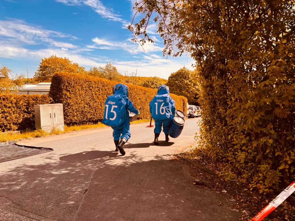 Die Feuerwehr führte unter besonderen Schutzmaßnahmen weitere Erkundungen durch. Hierzu kamen Einsatzkräfte in Chemikalienschutzanzügen zum Einsatz. Der ausgetretene Stoff wurde gesichert und in geeignete Fässer umgefüllt.